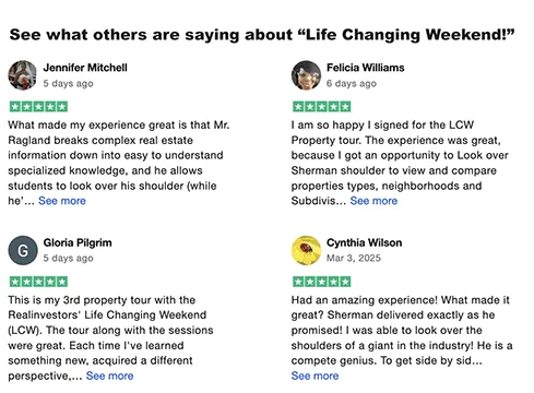 You'll have the chance to not only see these Highly Lucrative Real Estate Deals but spend time with the people who put them together and learn everything that happened "Step-by-Step" that made them possible.