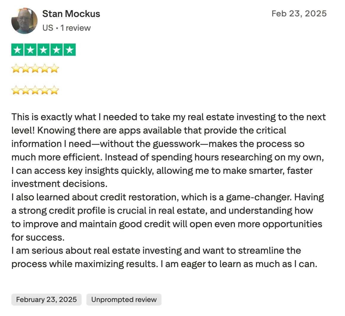 We "Cracked the Code", when we began to use A.I. for some of the most basic, proven, real estate strategies, like "Quick Cash!" and Driving for Dollars, but then we 10X'd the game by combining basic (mainly FREE) tools with Specific Weekly Training on how to not only use them, but to actually do more deals, bigger deals, and more importantly, FASTER DEALS! During our 4-Days together, you'll experience first hand how do deals in real time using A.I. as it should be used.